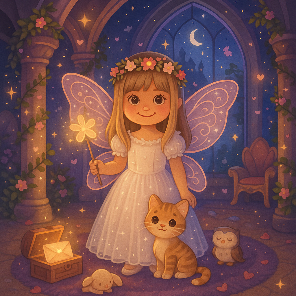 Once upon a time, there was a little fairy named Ann who lived in a starlit castle where dreams gently floated through the air. With her soft wings and a heart full of wonder, she sprinkled kindness wherever she flew. Her best friend, a curious kitten named Whiskers, followed close behind as they filled each night with sparkle, laughter, and just a touch of magic.