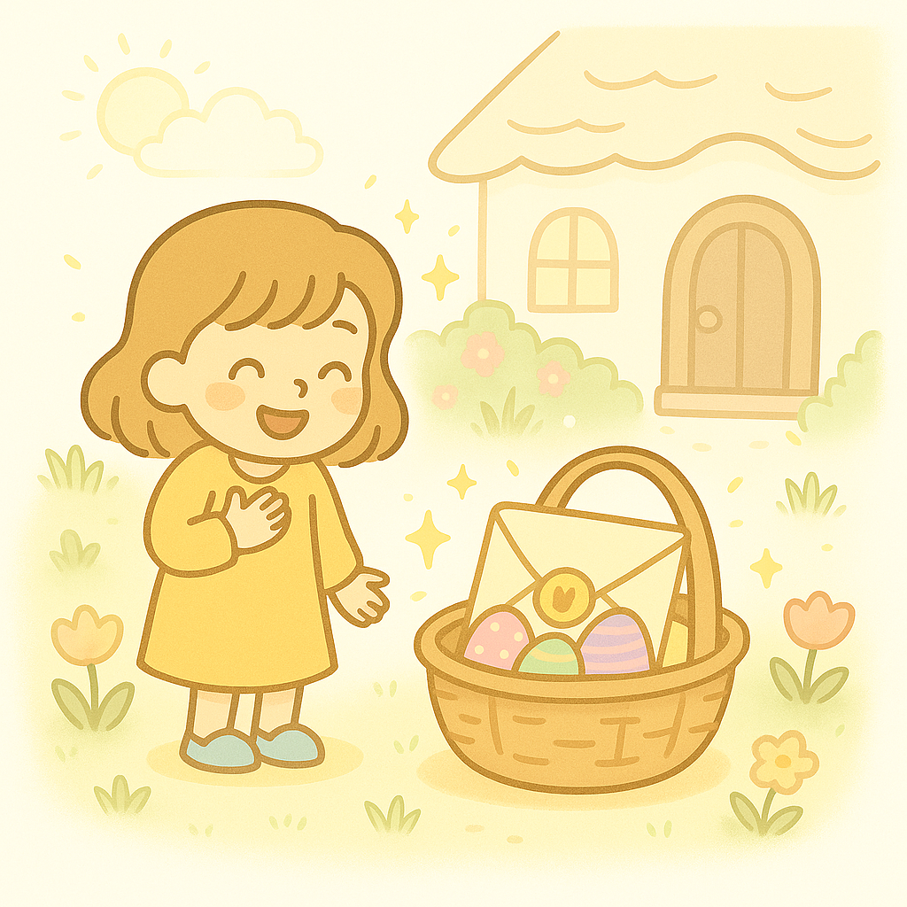 Every Easter morning, she found a basket filled with golden eggs on her porch, a gift from the magical Easter Bunny.