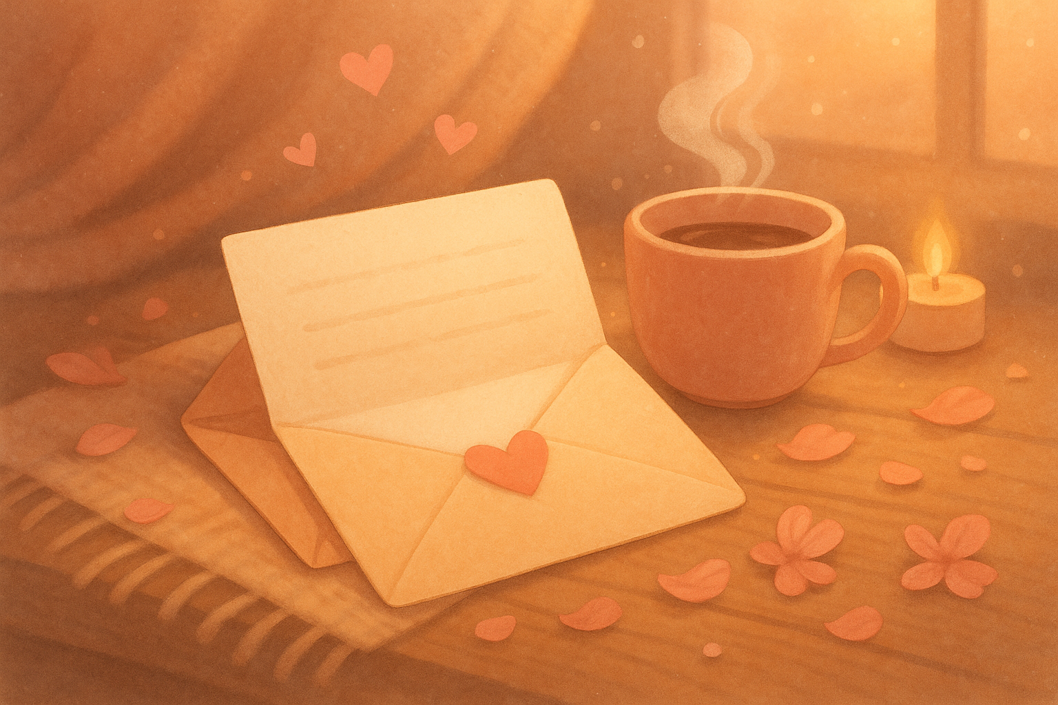 A beautifully handwritten note "discovered" under a pillow or in a coat pocket, with romantic charm ("Your smile is my favorite sunrise"). Optional whimsical sender: a fairy, a time traveler, or the universe itself!