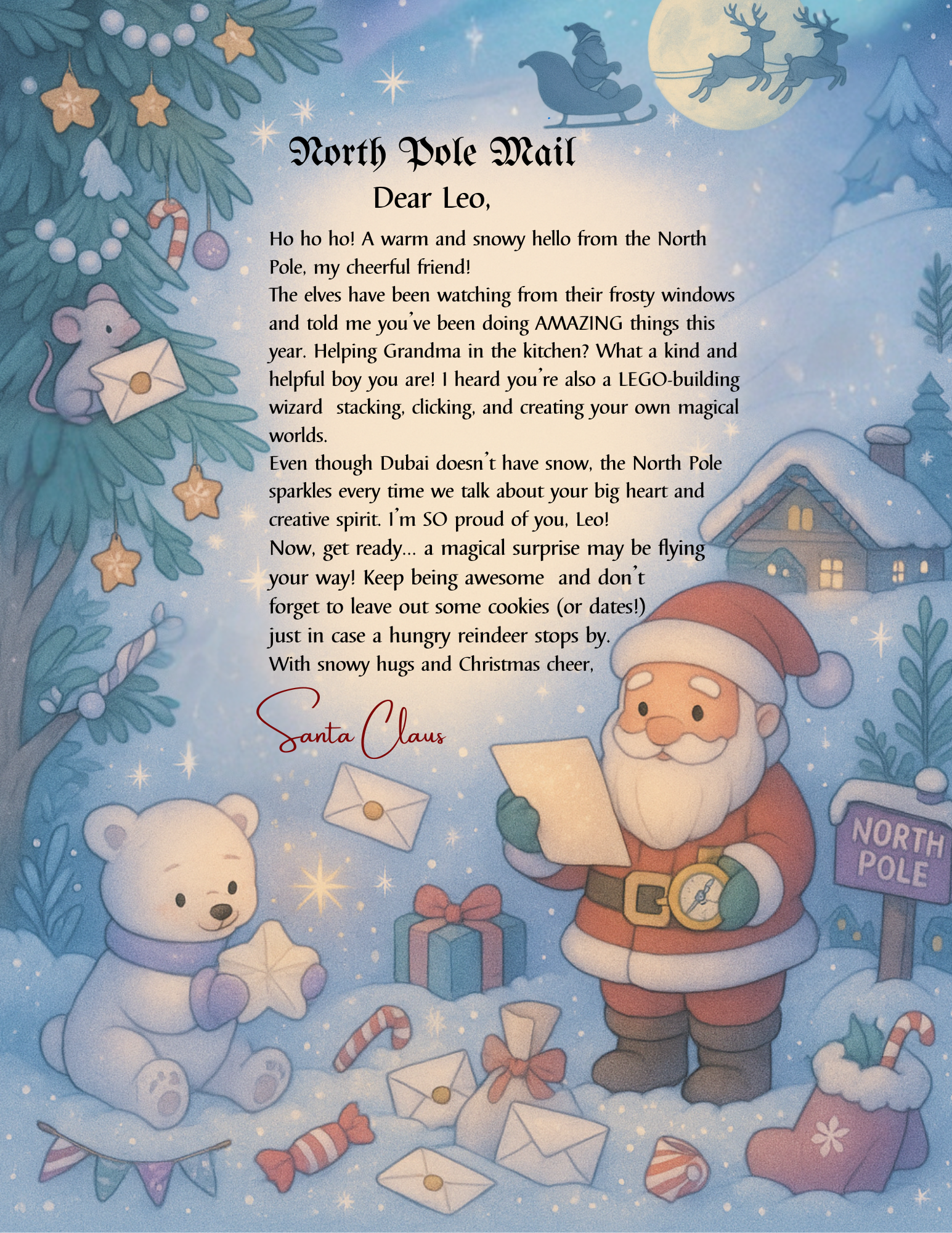 Let Santa mention your child’s name, age, and a few good deeds or moments that made you proud this year. We weave it all into a 100% unique story filled with love, belief, and recognition.